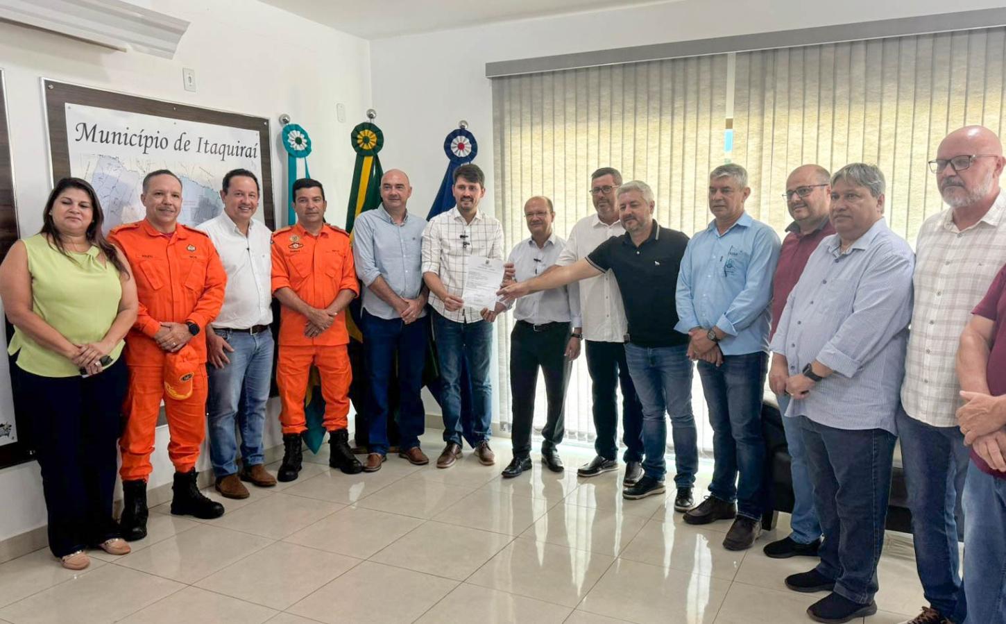 Itaquiraí (MS) – Em um evento que reuniu autoridades locais e estaduais, o governador de Mato Grosso do Sul em exercício, José Carlos Barbosa, assinou nesta quinta-feira (09) o Termo de Ordem de Serviço para a construção do quartel do Corpo de Bombeiros Militar em Itaquiraí. A cerimônia ocorreu no gabinete da prefeitura e contou com a presença do prefeito Thalles Tomazelli, que destacou a importância histórica da obra para o município.
